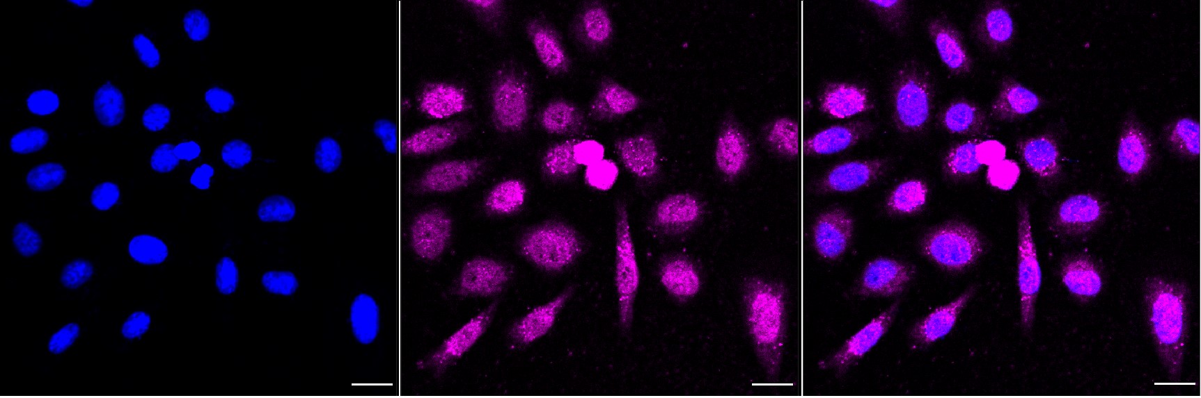 Immunocytochemical staining of HepG2 cells with ACADVL antibody. Nuclei were stained blue with DAPI; ACADVL was stained magenta with Alexa Fluor? 647. Images were taken using Leica stellaris 5. Protein abundance based on laser Intensity and smart gain: Medium. Scale bar, 20 μm.