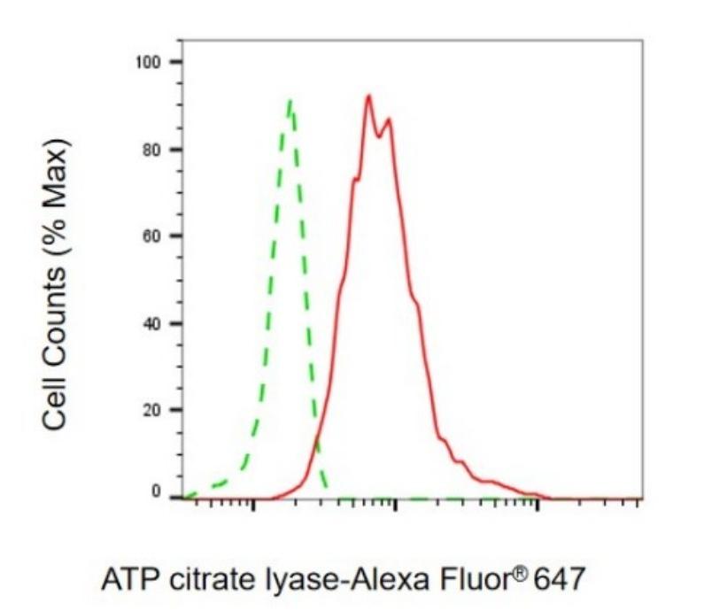 • Flow cytometric analysis of ATP citrate lyase expression in HepG2 cells using ATP citrate lyase antibody. Green, isotype control; red, ATP citrate lyase.