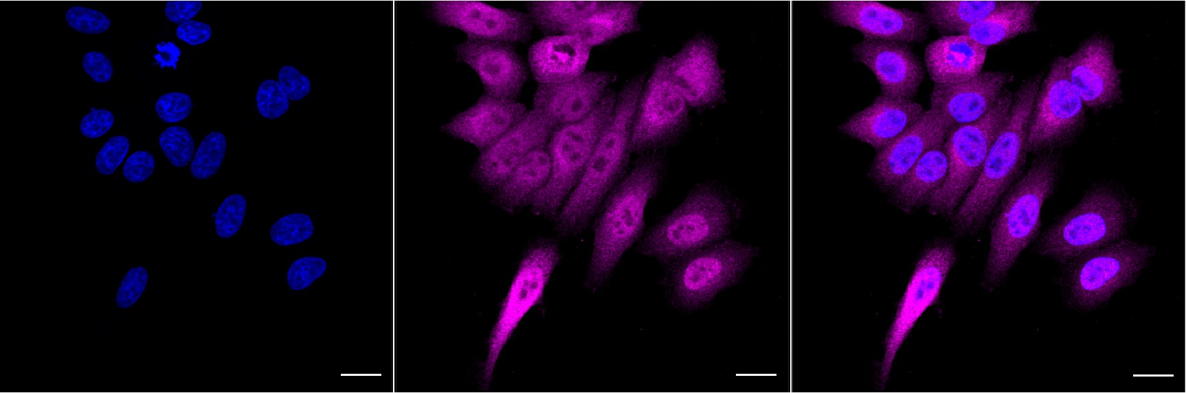 • Immunocytochemical staining of HepG2 cells with ATP citrate lyase antibody. Nuclei were stained blue with DAPI; ATP citrate lyase was stained magenta with Alexa Fluor? 647. Images were taken using Leica stellaris 5. Protein abundance based on laser Intensity and smart gain: High. Scale bar, 20 μm.