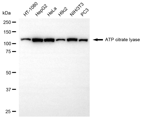 • Western blotting analysis using ATP citrate lyase antibody. Total cell lysates (30 μg) from various cell lines were loaded and separated by SDS-PAGE. The blot was incubated with ATP citrate lyase antibody and HRP-conjugated goat anti-rabbit secondary antibody respectively.