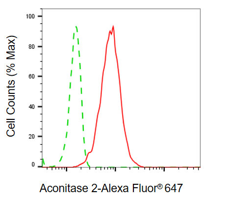 Flow cytometric analysis of aconitase 2 expression in HT-1080 cells using aconitase 2 antibody. Green, isotype control; red, aconitase 2.