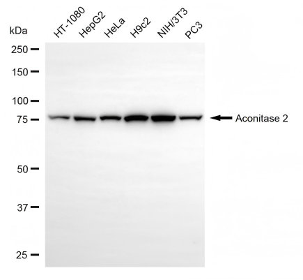Western blotting analysis using aconitase 2 antibody. Total cell lysates (30 μg) from various cell lines were loaded and separated by SDS-PAGE. The blot was incubated with aconitase 2 antibody and HRP-conjugated goat anti-rabbit secondary antibody respectively.
