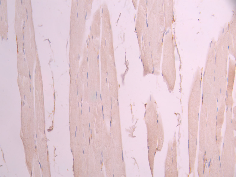 IHC image of CSB-RA952399A0HU diluted at 1:100 and staining in paraffin-embedded human skeletal muscle tissue performed on a Leica BondTM system. After dewaxing and hydration, antigen retrieval was mediated by high pressure in a citrate buffer (pH 6.0). Section was blocked with 10% normal goat serum 30min at RT. Then primary antibody (1% BSA) was incubated at 4°C overnight. The primary is detected by a Goat anti-rabbit polymer IgG labeled by HRP and visualized using 0.05% DAB.