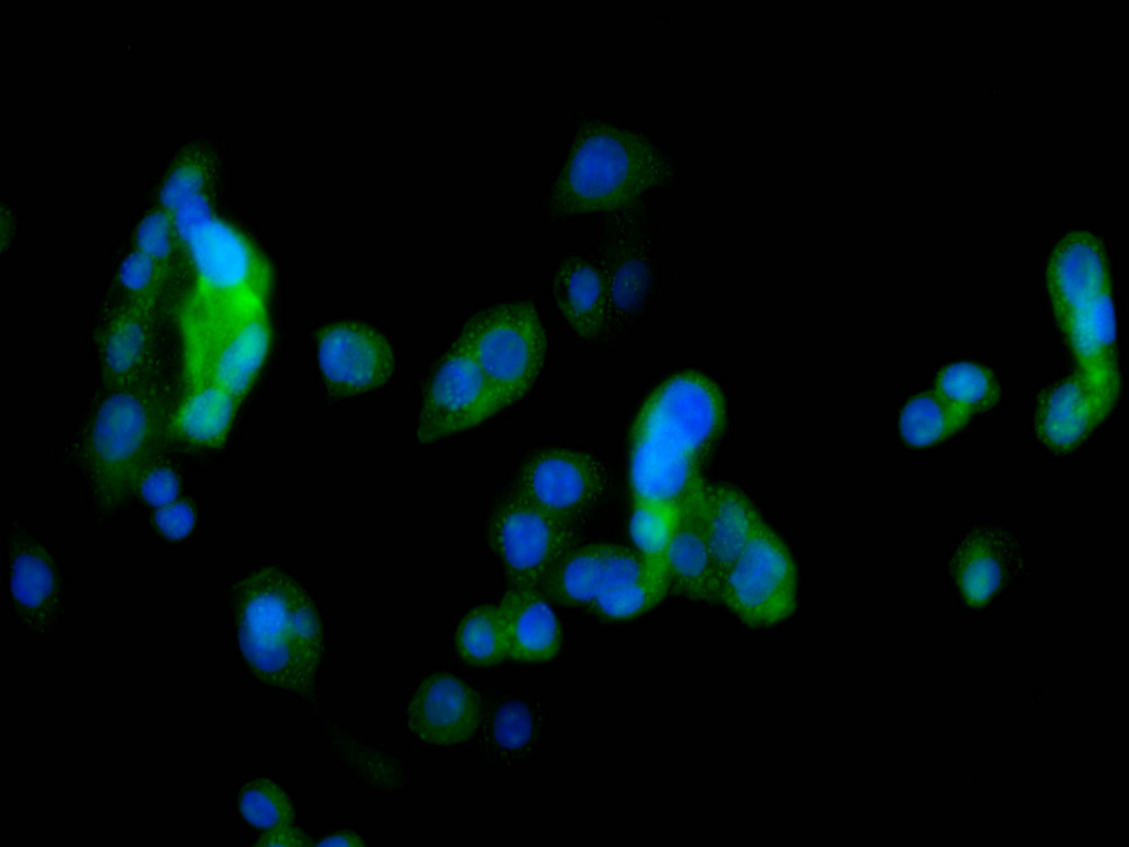 Immunofluorescence staining of HepG2 cell with CSB-RA234270A0HU at 1:50 , counter-stained with DAPI. The cells were fixed in 4% formaldehyde, permeabilized using 0.2% Triton X-100 and blocked in 10% normal Goat Serum. The cells were then incubated with the antibody overnight at 4°C. The secondary antibody was Alexa Fluor 488-congugated AffiniPure Goat Anti-Rabbit IgG(H+L).