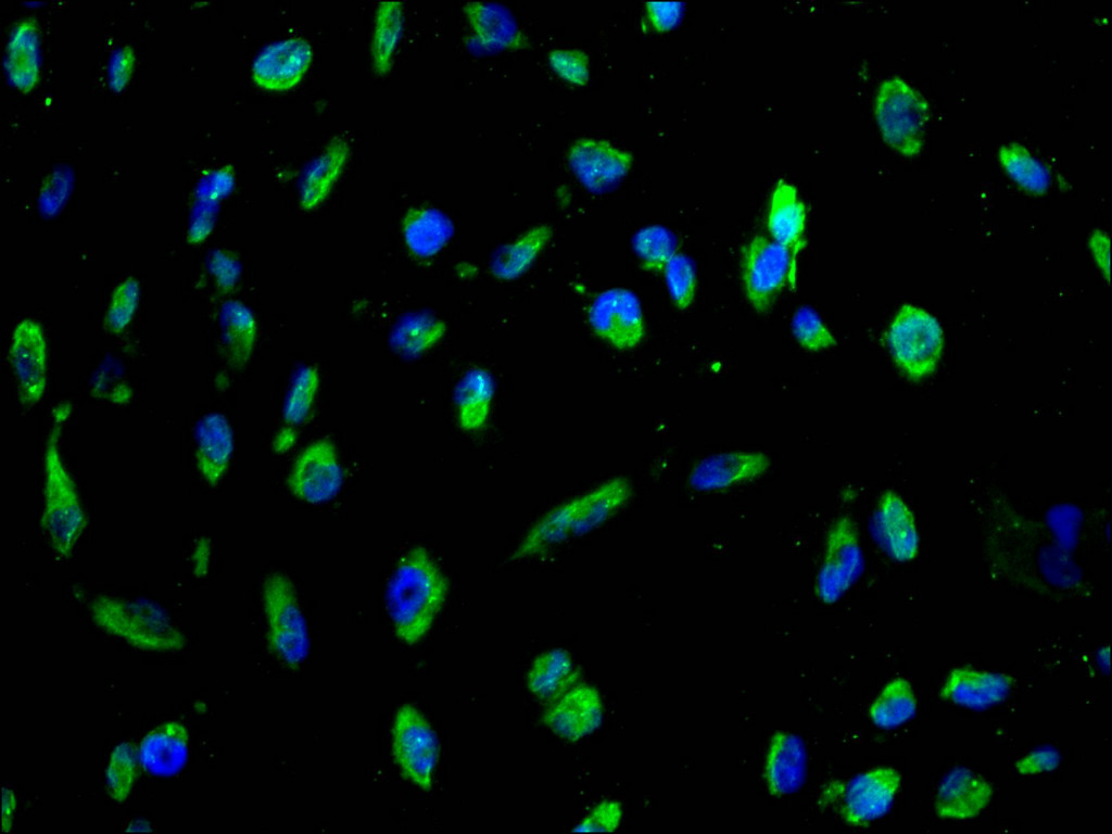 • Immunofluorescence staining of MCF-7 cell with CSB-RA562580A0HU at 1:50, counter-stained with DAPI. The cells were fixed in 4% formaldehyde and blocked in 10% normal Goat Serum. The cells were then incubated with the antibody overnight at 4°C. The secondary antibody was Alexa Fluor 488-congugated AffiniPure Goat Anti-Rabbit IgG(H+L).