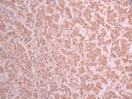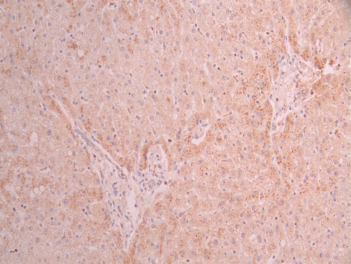 • IHC image of CSB-RA562580A0HU diluted at 1:100 and staining in paraffin-embedded human liver tissue performed on a Leica BondTM system. After dewaxing and hydration, antigen retrieval was mediated by high pressure in a citrate buffer (pH 6.0). Section was blocked with 10% normal goat serum 30min at RT. Then primary antibody (1% BSA) was incubated at 4°C overnight. The primary is detected by a Goat anti-rabbit polymer IgG labeled by HRP and visualized using 0.05% DAB.