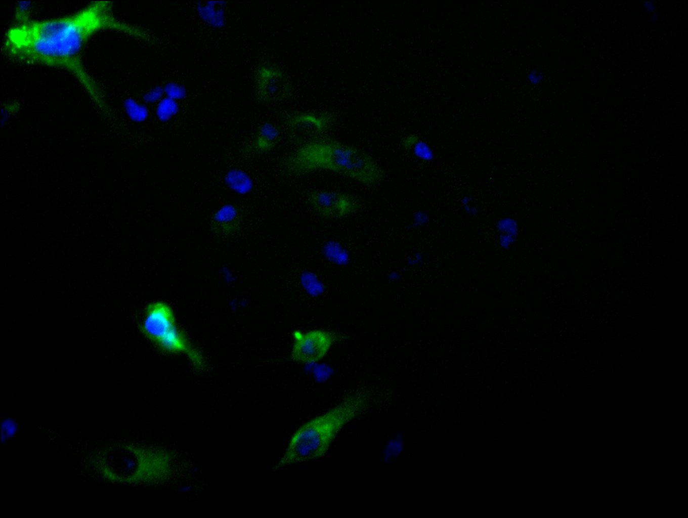 Immunofluorescence staining of HepG2 cell with CSB-RA928689A0HU at 1:50, counter-stained with DAPI. The cells were fixed in 4% formaldehyde, permeabilized using 0.2% Triton X-100 and blocked in 10% normal Goat Serum. The cells were then incubated with the antibody overnight at 4°C. The secondary antibody was Alexa Fluor 488-congugated AffiniPure Goat Anti-Rabbit IgG(H+L).