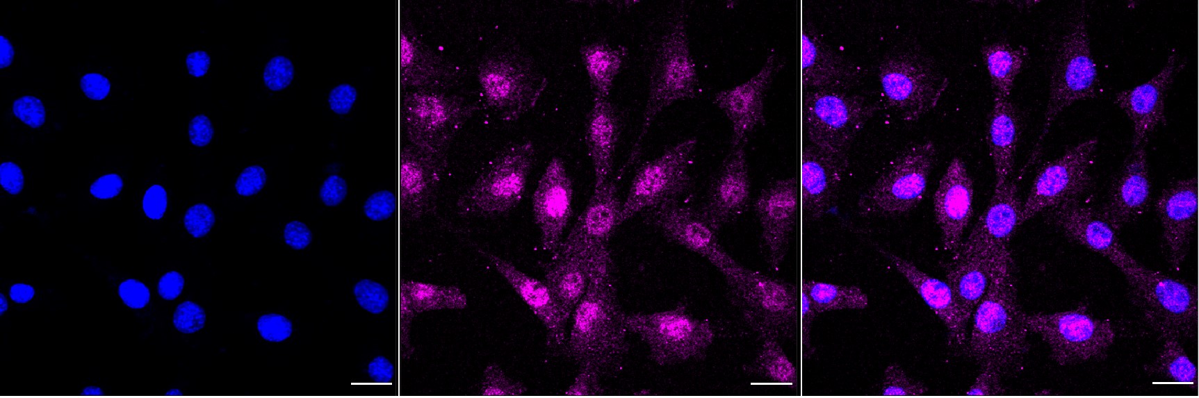 • Immunocytochemical staining of C2C12 cells with Phospho-AKT1 (S124) antibody. Nuclei were stained blue with DAPI; Phospho-AKT1 (S124) was stained magenta with Alexa Fluor? 647. Images were taken using Leica stellaris 5. Protein abundance based on laser Intensity and smart gain: Medium. Scale bar, 20 μm.