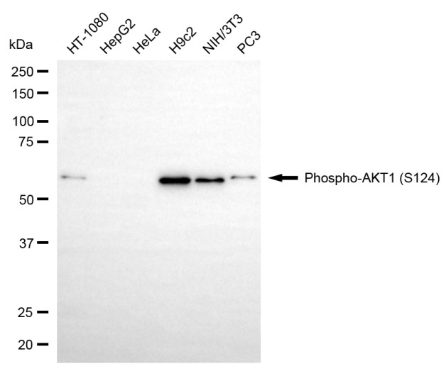 • Western blotting analysis using phospho-AKT1 (S124) antibody. Total cell lysates (30 μg) from various cell lines were loaded and separated by SDS-PAGE. The blot was incubated with phospho-AKT1 (S124) antibody and HRP-conjugated goat anti-rabbit secondary antibody respectively.
