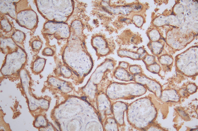IHC image of CSB-RA183247A0HU diluted at 1:50 and staining in paraffin-embedded human placenta tissue performed on a Leica BondTM system. After dewaxing and hydration, antigen retrieval was mediated by high pressure in a citrate buffer (pH 6.0). Section was blocked with 10% normal goat serum 30min at RT. Then primary antibody (1% BSA) was incubated at 4°C overnight. The primary is detected by a Goat anti-rabbit polymer IgG labeled by HRP and visualized using 0.39% DAB.