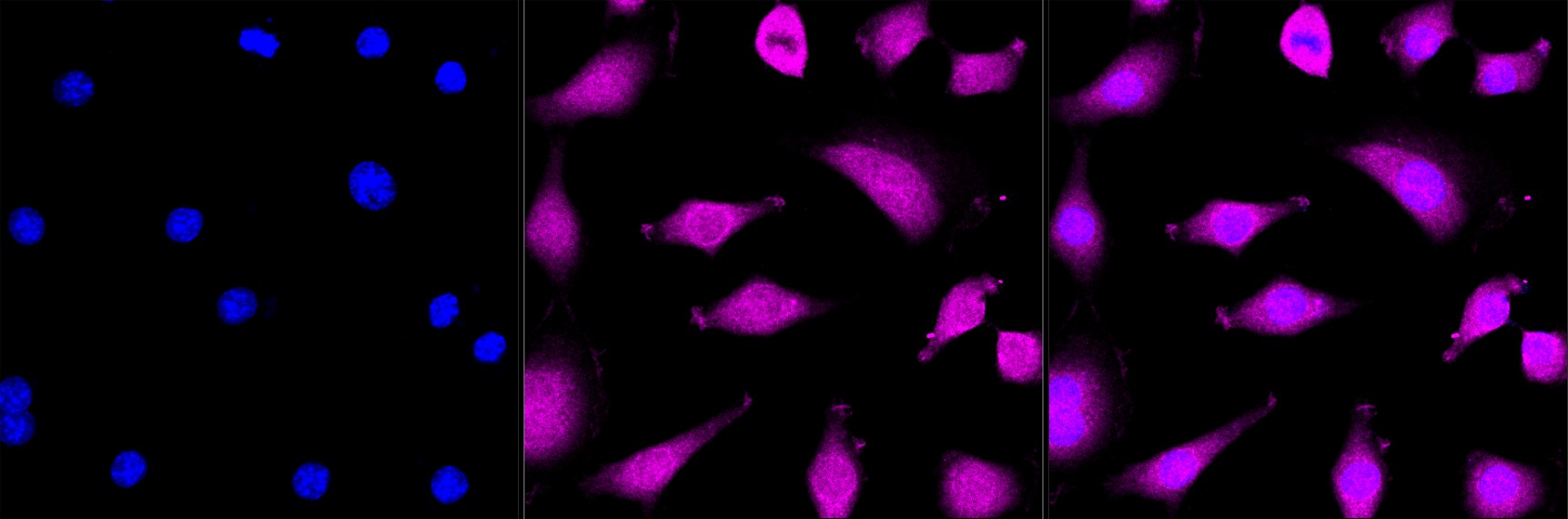 • Immunocytochemical staining of C2C12 cells with Annexin A4 antibody. Nuclei were stained blue with DAPI; Annexin A4 was stained magenta with Alexa Fluor? 647. Images were taken using Leica stellaris 5. Protein abundance based on laser Intensity and Smart Gain: High. Scale bar, 20 μm.