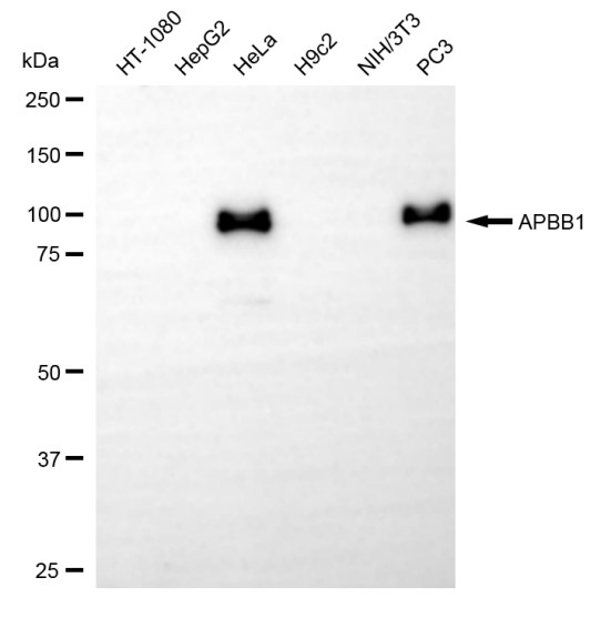 Western blotting analysis using APBB1 antibody. Total cell lysates (30 μg) from various cell lines were loaded and separated by SDS-PAGE. The blot was incubated with APBB1 antibody and HRP-conjugated goat anti-rabbit secondary antibody respectively.