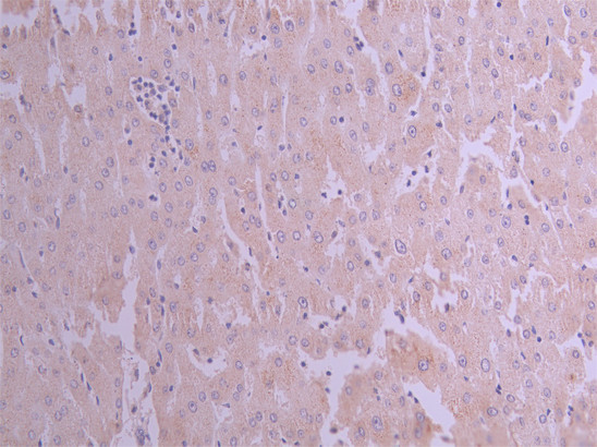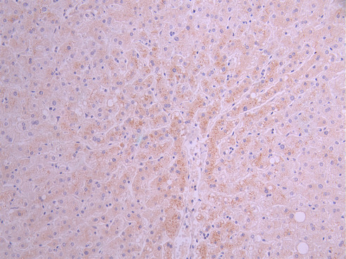 IHC image of CSB-RA002005MA1HU diluted at 1:50 and staining in paraffin-embedded human liver tissue performed on a Leica BondTM system. After dewaxing and hydration, antigen retrieval was mediated by high pressure in a citrate buffer (pH 6.0). Section was blocked with 10% normal goat serum 30min at RT. Then primary antibody (1% BSA) was incubated at 4°C overnight. The primary is detected by a Anti-Human lgG, Fcy Fragment Specific labeled by HRP and visualized using 0.05% DAB.