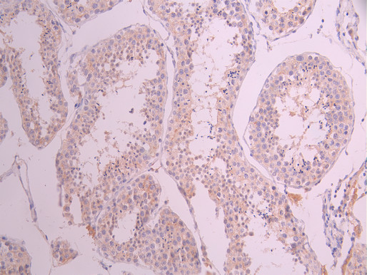 IHC image of CSB-RA002005MA1HU diluted at 1:50 and staining in paraffin-embedded human testis tissue performed on a Leica BondTM system. After dewaxing and hydration, antigen retrieval was mediated by high pressure in a citrate buffer (pH 6.0). Section was blocked with 10% normal goat serum 30min at RT. Then primary antibody (1% BSA) was incubated at 4°C overnight. The primary is detected by a Anti-Human lgG, Fcy Fragment Specific labeled by HRP and visualized using 0.05% DAB.