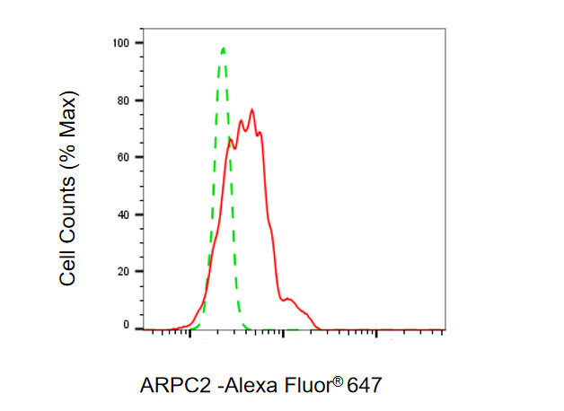 Flow cytometric analysis of ARPC2 expression in HT-1080 cells using ARPC2 antibody. Green, isotype control; red, ARPC2.