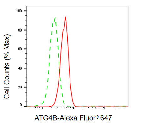 Flow cytometric analysis of ATG4B expression in C2C12 cells using ATG4B antibody. Green, isotype control; red, ATG4B.