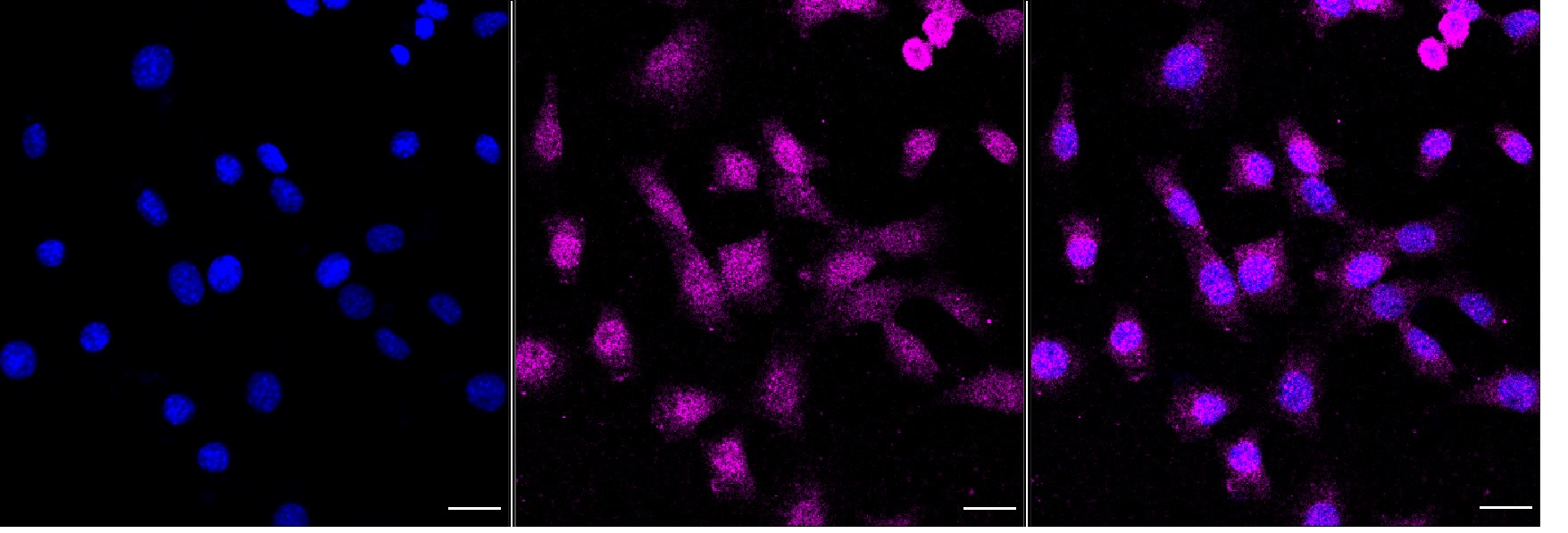 Immunocytochemical staining of C2C12 cells with ATG4B?antibody. Nuclei were stained blue with DAPI; ATG4B was stained magenta with Alexa Fluor? 647. Images were taken using Leica stellaris 5. Protein abundance based on laser Intensity and smart gain: Low. Scale bar, 20 μm.