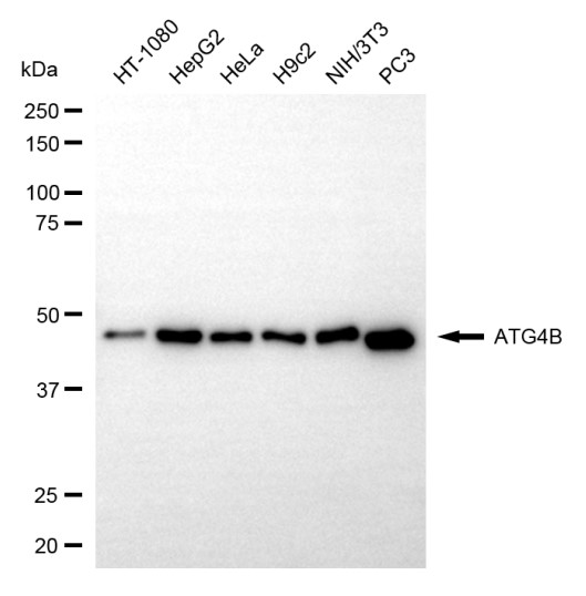 Western blotting analysis using ATG4B antibody. Total cell lysates (30 μg) from various cell lines were loaded and separated by SDS-PAGE. The blot was incubated with ATG4B antibody and HRP-conjugated goat anti-rabbit secondary antibody respectively.