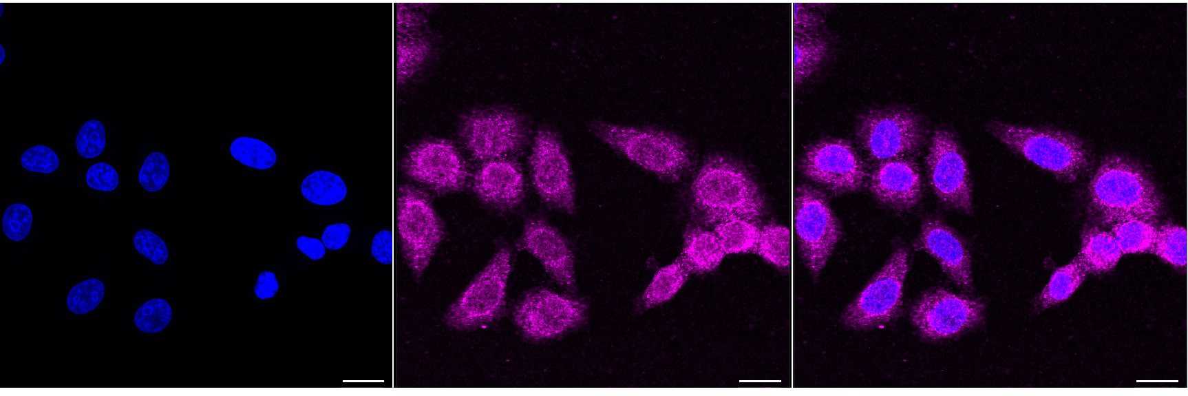 Immunocytochemical staining of HepG2 cells with Atg4C antibody. Nuclei were stained blue with DAPI; Atg4C was stained magenta with Alexa Fluor? 647. Images were taken using Leica stellaris 5. Protein abundance based on laser Intensity and smart gain: Medium. Scale bar, 20 μm.