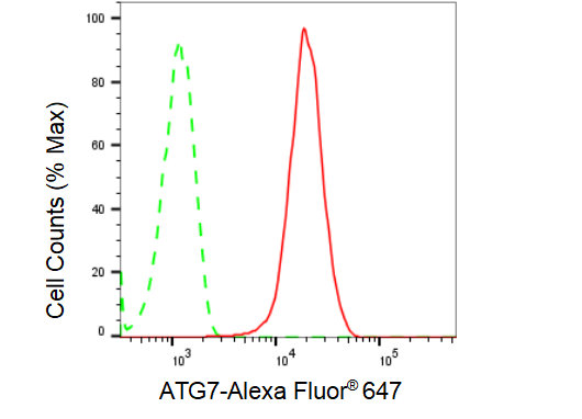 • Flow cytometric analysis of ATG7 expression in HepG2 cells using ATG7 antibody. Green, isotype control; red, ATG7.