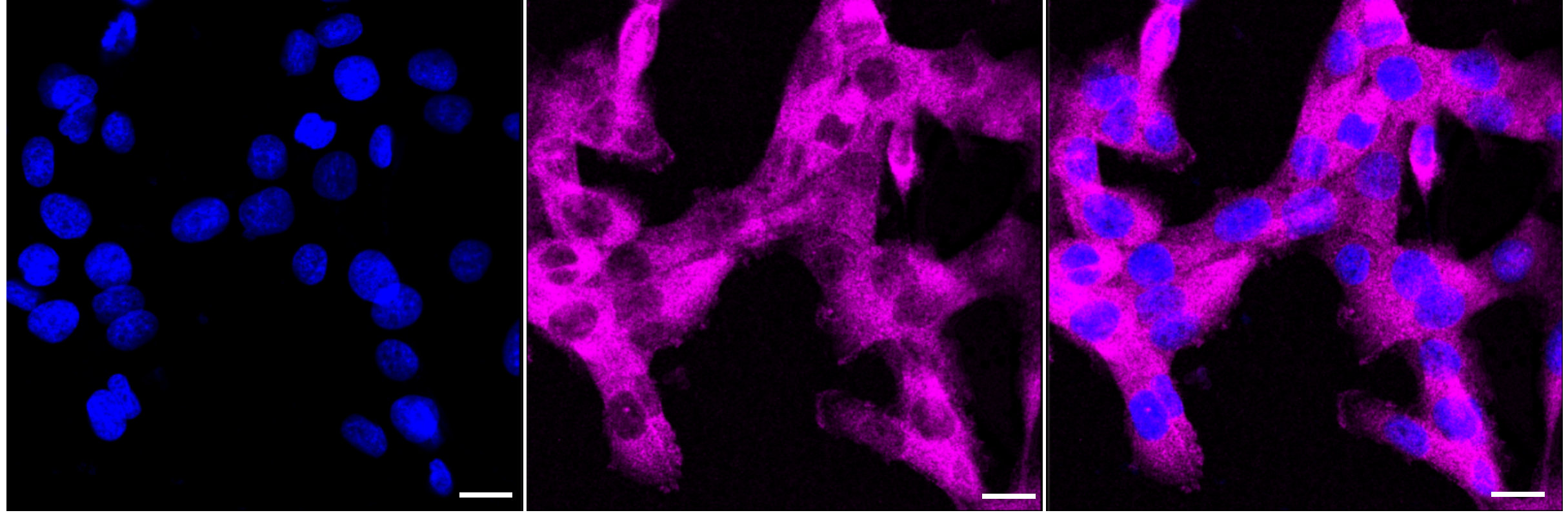 • Immunocytochemical staining of HT-1080 cells with ATG7 antibody. Nuclei were stained blue with DAPI; ATG7 was stained magenta with Alexa Fluor? 647. Images were taken using Leica stellaris 5. Protein abundance based on laser Intensity and smart gain: Medium. Scale bar: 20 μm.