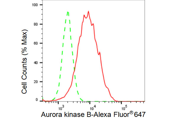 Flow cytometric analysis of Aurora kinase B expression in HAP-1 cells using Aurora kinase B antibody. Green, isotype control; red, Aurora kinase B.