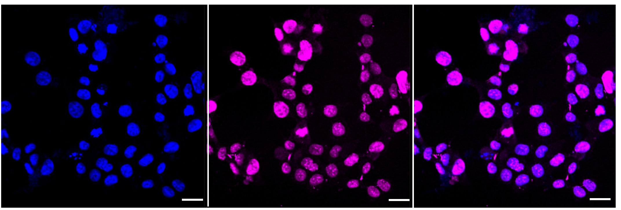 Immunocytochemical staining of HAP-1 cells with Aurora kinase B antibody. Nuclei were stained blue with DAPI; Aurora kinase B was stained magenta with Alexa Fluor? 647. Images were taken using Leica stellaris 5. Protein abundance based on laser Intensity and smart gain: High. Scale bar: 20 μm.
