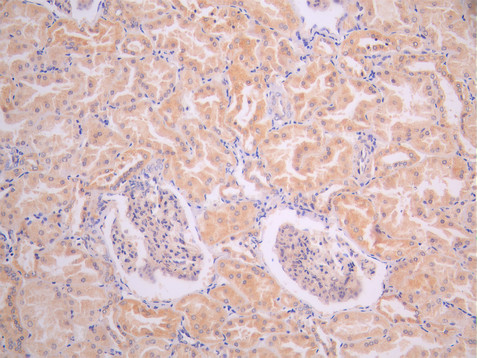 • IHC image of CSB-RA016426A0MO diluted at 1:100 and staining in paraffin-embedded human kidney tissue performed on a Leica BondTM system. After dewaxing and hydration, antigen retrieval was mediated by high pressure in a citrate buffer (pH 6.0). Section was blocked with 10% normal goat serum 30min at RT. Then primary antibody (1% BSA) was incubated at 4°C overnight. The primary is detected by a Goat anti-rabbit polymer IgG labeled by HRP and visualized using 0.05% DAB.