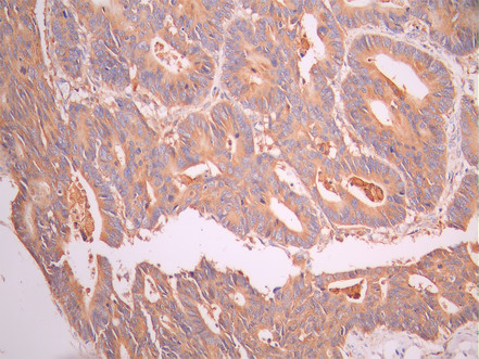 • IHC image of CSB-RA016426A0MO diluted at 1:100 and staining in paraffin-embedded human colorectal cancer performed on a Leica BondTM system. After dewaxing and hydration, antigen retrieval was mediated by high pressure in a citrate buffer (pH 6.0). Section was blocked with 10% normal goat serum 30min at RT. Then primary antibody (1% BSA) was incubated at 4°C overnight. The primary is detected by a Goat anti-rabbit polymer IgG labeled by HRP and visualized using 0.05% DAB.