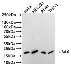 Positive WB detected in: Hela whole cell lysate(20μg), HEK293 whole cell lysate(20μg), A549 whole cell lysate(20μg), THP-1 whole cell lysate(20μg)