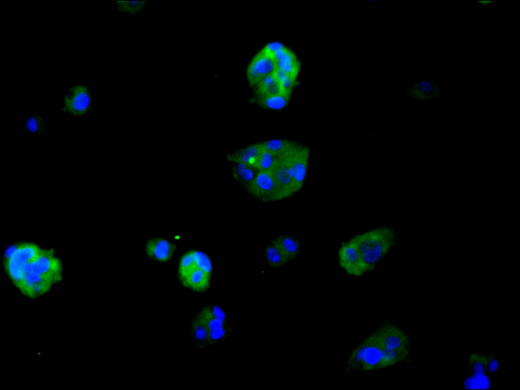 Immunofluorescence staining of HepG2 cell with CSB-RA898039A0HU at 1:50, counter-stained with DAPI. The cells were fixed in 4% formaldehyde, permeabilized using 0.2% Triton X-100 and blocked in 10% normal Goat Serum. The cells were then incubated with the antibody overnight at 4°C. The secondary antibody was Alexa Fluor 488-congugated AffiniPure Goat Anti-Rabbit IgG(H+L).