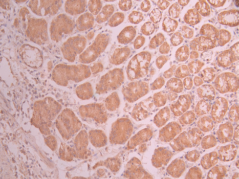 IHC image of CSB-RA898039A0HU diluted at 1:100 and staining in paraffin-embedded human gastric cancer performed on a Leica BondTM system. After dewaxing and hydration, antigen retrieval was mediated by high pressure in a citrate buffer (pH 6.0). Section was blocked with 10% normal goat serum 30min at RT. Then primary antibody (1% BSA) was incubated at 4°C overnight. The primary is detected by a Goat anti-rabbit polymer IgG labeled by HRP and visualized using 0.05% DAB.