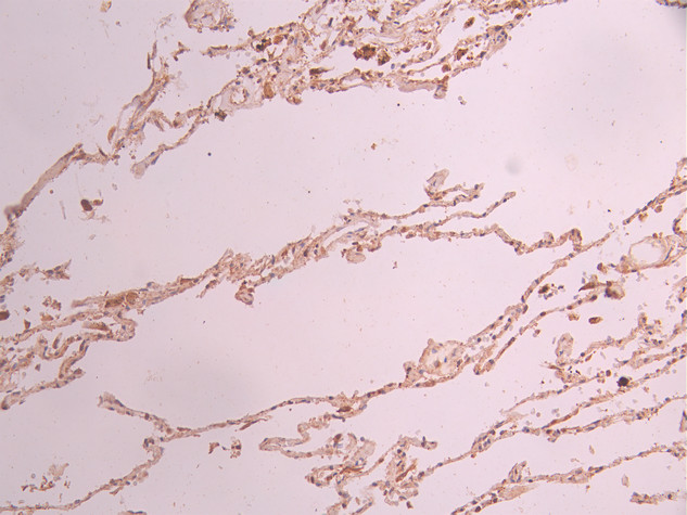IHC image of CSB-RA898039A0HU diluted at 1:100 and staining in paraffin-embedded human lung tissue performed on a Leica BondTM system. After dewaxing and hydration, antigen retrieval was mediated by high pressure in a citrate buffer (pH 6.0). Section was blocked with 10% normal goat serum 30min at RT. Then primary antibody (1% BSA) was incubated at 4°C overnight. The primary is detected by a Goat anti-rabbit polymer IgG labeled by HRP and visualized using 0.05% DAB.