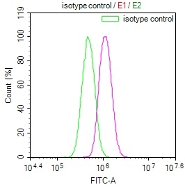 Overlay Peak curve showing PC3 cells stained with CSB-RA834263A0HU (red line) at 1:100. The cells were fixed in 4% formaldehyde and permeated by 0.2% TritonX-100. Then 10% normal goat serum to block non-specific protein-protein interactions followed by the antibody (1ug/1*106cells) for 45min at 4℃. The secondary antibody used was FITC-conjugated Goat Anti-rabbit IgG(H+L) at 1:200 dilution for 35min at 4℃.Control antibody (green line) was rabbit IgG (1ug/1*106cells) used under the same conditions. Acquisition of >10,000 events was performed.