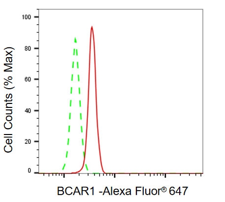• Flow cytometric analysis of BCAR1 expression in H9C2 cells using BCAR1 antibody. Green, isotype control; red, BCAR1.