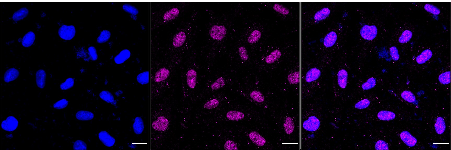 • Immunocytochemical staining of H9c2 cells with BCAR1 antibody. Nuclei were stained blue with DAPI; BCAR1 was stained magenta with Alexa Fluor? 647. Images were taken using Leica stellaris 5. Protein abundance based on laser Intensity and smart gain: Medium. Scale bar, 20 μm.