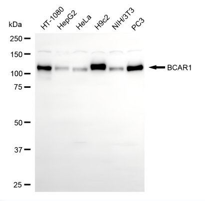 • Western blotting analysis using BCAR1 antibody. Total cell lysates (30 μg) from various cell lines were loaded and separated by SDS-PAGE. The blot was incubated with BCAR1 antibody and HRP-conjugated goat anti-rabbit secondary antibody respectively.