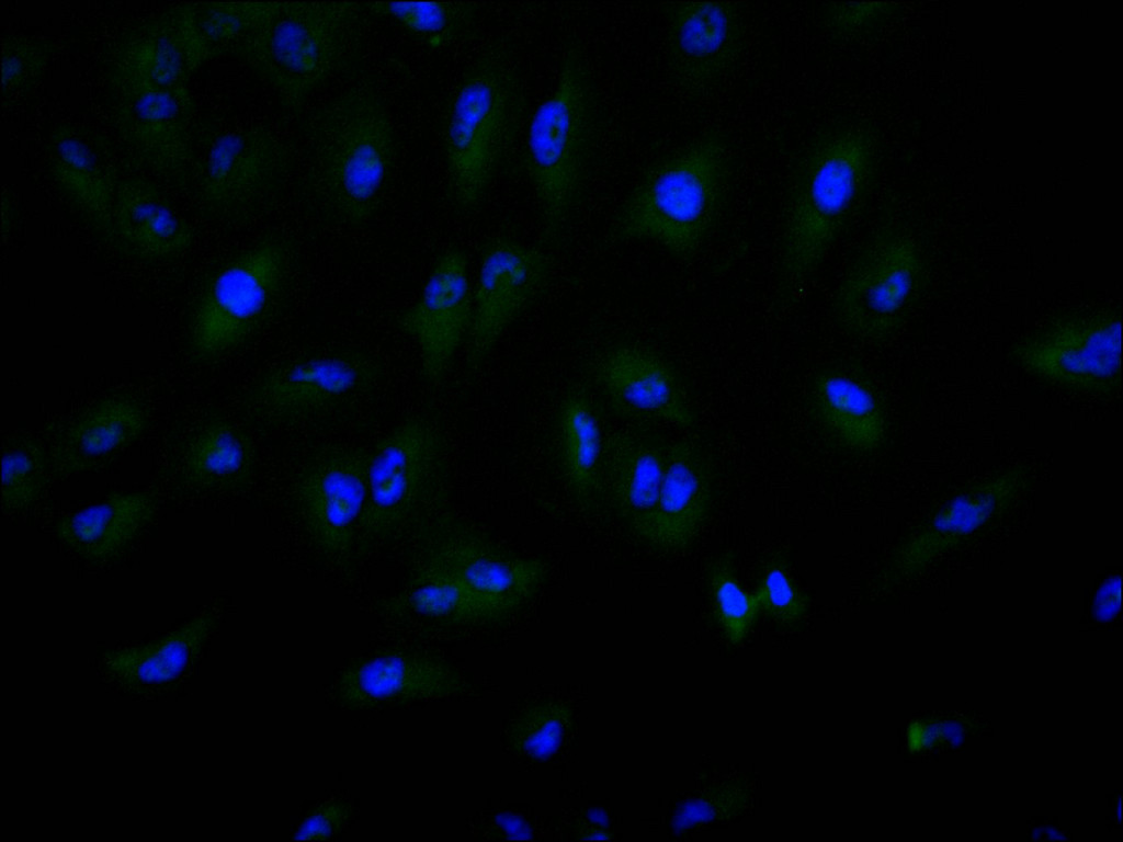 • Immunofluorescence staining of U-251MG cell with CSB-RA936743A0HU at 1:50, counter-stained with DAPI. The cells were fixed in 4% formaldehyde, permeabilized using 0.2% Triton X-100 and blocked in 10% normal Goat Serum. The cells were then incubated with the antibody overnight at 4°C. The secondary antibody was Alexa Fluor 488-congugated AffiniPure Goat Anti-Rabbit IgG(H+L).