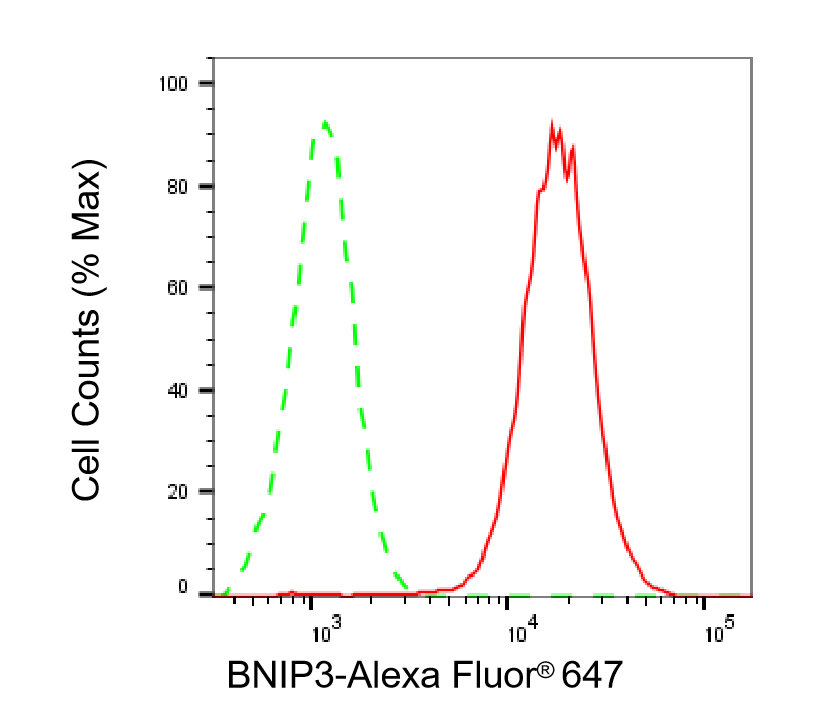 • Flow cytometric analysis of BNIP3 expression in C2C12 cells using BNIP3 antibody. Green, isotype control; red, BNIP3.