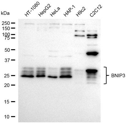• Western blotting analysis using BNIP3 antibody. Total cell lysates (30 μg) from various cell lines were loaded and separated by SDS-PAGE. The blot was incubated with BNIP3 antibody and HRP-conjugated goat anti-rabbit secondary antibody respectively.