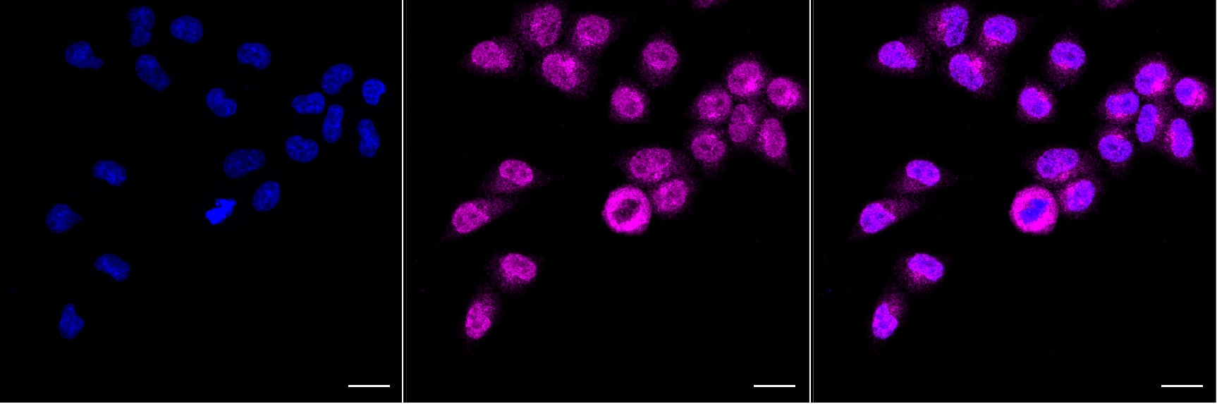 Immunocytochemical staining of HepG2 cells with Chromosome 3 open reading frame 38 antibody. Nuclei were stained blue with DAPI; Chromosome 3 open reading frame 38 was stained magenta with Alexa Fluor? 647. Images were taken using Leica stellaris 5. Protein abundance based on laser Intensity and smart gain: High. Scale bar, 20 μm.