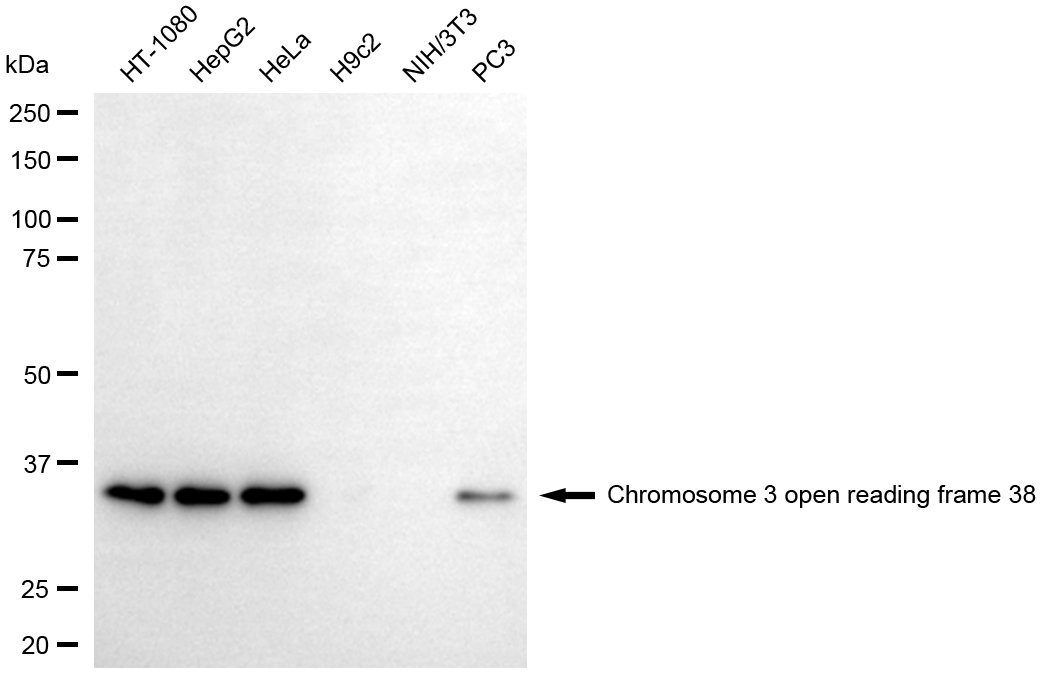Western blotting analysis using chromosome 3 open reading frame 38 antibody. Total cell lysates (30 μg) from various cell lines were loaded and separated by SDS-PAGE. The blot was incubated with chromosome 3 open reading frame 38 antibody and HRP-conjugated goat anti-rabbit secondary antibody respectively.