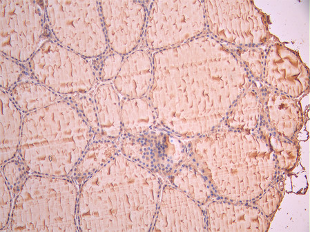 IHC image of CSB-RA004434MA1HU diluted at 1:50 and staining in paraffin-embedded human thyroid tissue performed on a Leica BondTM system. After dewaxing and hydration, antigen retrieval was mediated by high pressure in a citrate buffer (pH 6.0). Section was blocked with 10% normal goat serum 30min at RT. Then primary antibody (1% BSA) was incubated at 4°C overnight. The primary is detected by a Anti-Human lgG, Fcy Fragment Specific labeled by HRP and visualized using 0.05% DAB.