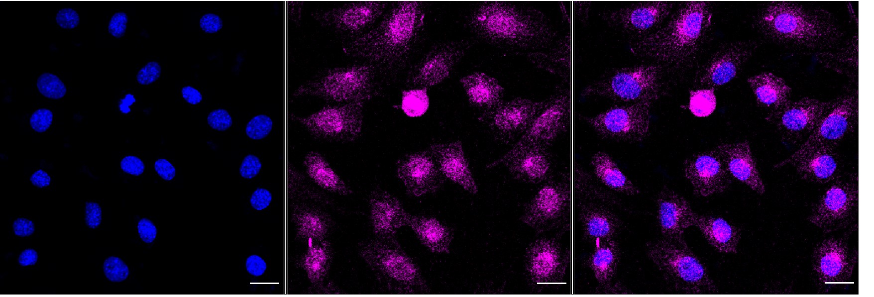Immunocytochemical staining of C2C12 cells with Calpain 1?antibody. Nuclei were stained blue with DAPI; Calpain 1 was stained magenta with Alexa Fluor? 647. Images were taken using Leica stellaris 5. Protein abundance based on laser Intensity and smart gain: Medium. Scale bar, 20 μm.
