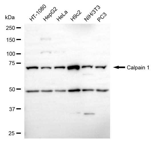 Western blotting analysis using calpain 1 antibody. Total cell lysates (30 μg) from various cell lines were loaded and separated by SDS-PAGE. The blot was incubated with calpain 1 antibody and HRP-conjugated goat anti-rabbit secondary antibody respectively.