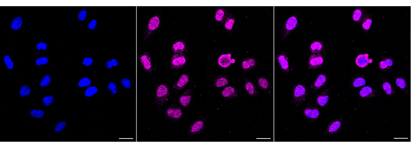 Immunocytochemical staining of HepG2 cells with Caspase 2 antibody. Nuclei were stained blue with DAPI; Caspase 2 was stained magenta with Alexa Fluor? 647. Images were taken using Leica stellaris 5. Protein abundance based on laser Intensity and smart gain: Low. Scale bar, 20 μm.