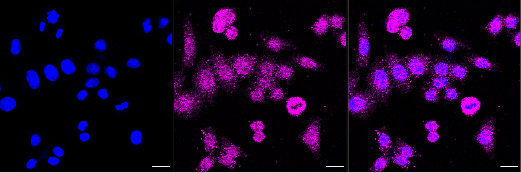 Immunocytochemical staining of HepG2 cells with caspase 2 antibody. Nuclei were stained blue with DAPI; Caspase 2 was stained magenta with Alexa Fluor? 647. Images were taken using Leica stellaris 5. Protein abundance based on laser Intensity and smart gain: Medium. Scale bar, 20 μm.