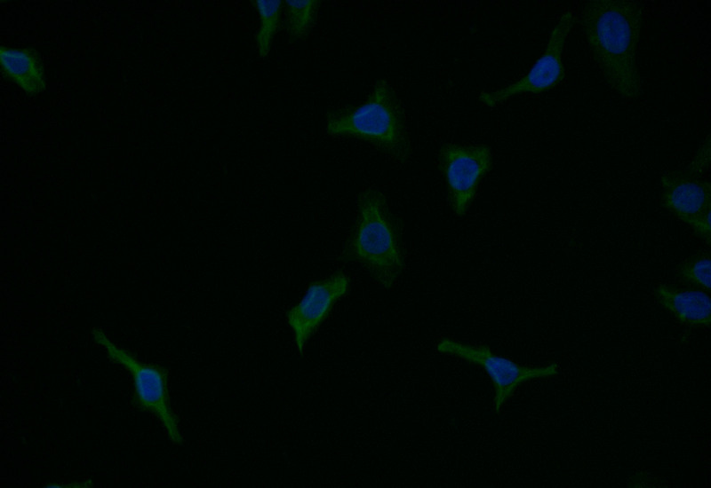 Immunofluorescence staining of HepG2 with CSB-RA940979A0HU at 1:7, counter-stained with DAPI. The cells were fixed in 4% formaldehyde and blocked in 10% normal Goat Serum. The cells were then incubated with the antibody overnight at 4°C. The secondary antibody was Alexa Fluor 525-congugated AffiniPure Goat Anti-Rabbit IgG(H+L).