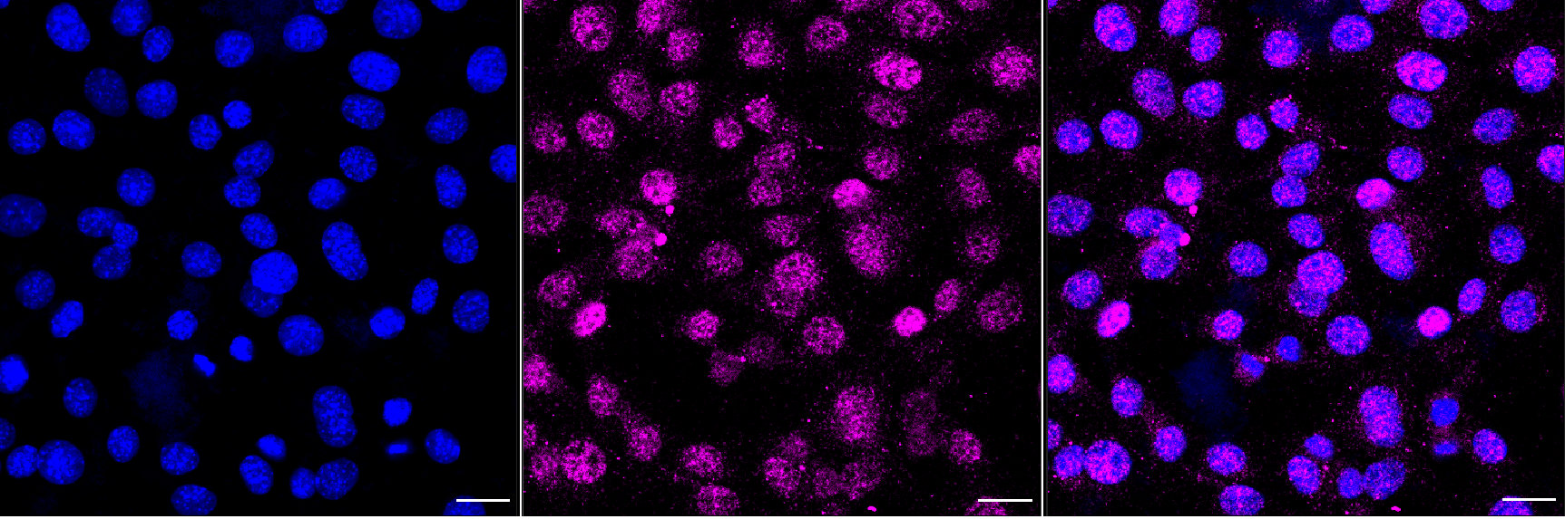 Immunocytochemical staining of C2C12 cells with Core-binding factor subunit beta antibody. Nuclei were stained blue with DAPI; Core-binding factor subunit beta was stained magenta with Alexa Fluor? 647. Images were taken using Leica stellaris 5. Protein abundance based on laser Intensity and smart gain: Medium. Scale bar, 20 μm.