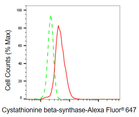 Flow cytometric analysis of cystathionine beta-synthase expression in HeLa cells using cystathionine beta-synthase antibody. Green, isotype control; red, cystathionine beta-synthase.